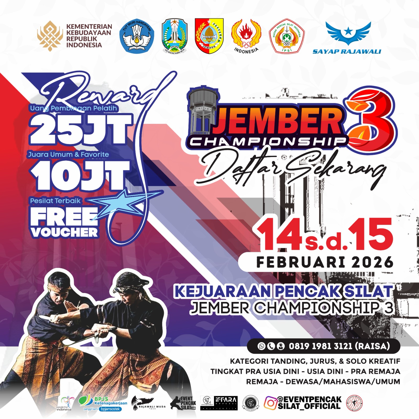 JEMBER J NYA APA? JUARA JUARA JUARA ====== ๐ผ๐ข๐ผ ====== Assalamualaikum warohmatullahi wabarokatuh, salam pencak silat !!!! sudah siapkah kamu membuang ego mu di gelanggang ?!?! Siapkan mental dan fisik kalian untuk mengalahkan ketakutanmu di Kejuaraan Pencak Silat di ๐ฅ JEMBER CHAMPIONSHIP 3 ๐ฅ Kejuaraan akan diselenggarakan untuk kalian para pesilat muda pada : ๐ : 14 - 15 Februari 2026 ๐: GOR PKPSO Jember benefits: ๐ MEMPEREBUTKAN PIALA KEMETERIAN KEBUDAYAAN RI ๐ MEMPEREBUTKAN PIALA JUARA FAVORIT 1,2,DAN 3 ๐ MEMPEREBUTKAN JUARA UMUM 1,2 DAN 3 ๐ PIALA PESILAT TERBAIK DAN VOUCHER NEXT EVENT ๐ฅ SELURUH PESERTA MENDAPAT SERTIFIKAT DAN MEDALI ๐ EVENT AKAN TERCATAT DIKURASI PUSPRESNAS KEMENDIKBUD ๐จ SELURUH PESERTA DIASURANSIKAN BPJSTK ๐๐๐ญ๐๐ ๐จ๐ซ๐ข ๐ฆ๐ฎ๐ฅ๐๐ข ๐๐๐ซ๐ข ๐๐/๐๐ซ๐ ๐๐ฌ๐ข๐ ๐๐ข๐ง๐ข, ๐๐/๐๐ฌ๐ข๐ ๐๐ข๐ง๐ข, ๐๐๐/๐๐๐ฌ/๐๐๐๐๐ซ๐๐ฃ๐๐ญ, ๐๐๐/๐๐/๐๐๐๐๐ซ๐๐ฃ๐๐ญ ๐ก๐ข๐ง๐ ๐ ๐ ๐๐๐๐๐๐๐๐๐/๐๐๐ฐ๐๐ฌ๐/๐๐ฆ๐ฎ๐ฆ ๐Info selengkapnya Admin Raisa 081919813121 ๐ธ Instagram @sayaprajawali.eo media partner : @eventpencaksilat_official